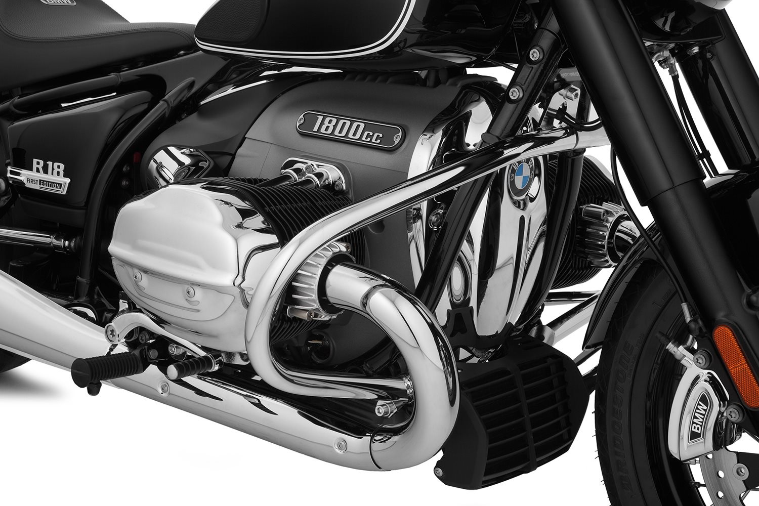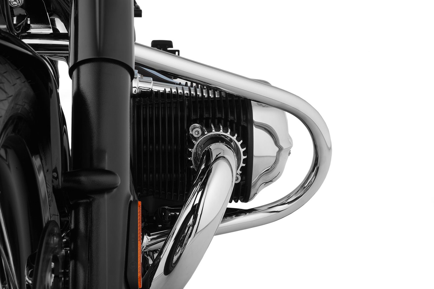 Der erste Schutzbügel aus 32er Rohr! Wir haben uns aus zweierlei Gründen für diese Rohrdimension entschieden: Aus Festigkeitsgründen, um die R 18 optimal zu schützen und aus ästhetischen Gründen. Denn nur das 32er Rohr wirkt an der imposanten R 18 -und im Umfeld der mächtigen Krümmer Rohre- ausgewogen und ästhetisch. Darüber hinaus haben wir uns bewusst für eine geschlossene, einteilige Form des Schutzbügels entschieden, die, neben der Dimensionierung, zusätzliche konstruktive Steifigkeit beiträgt. So fügt sich der hochwertig verchromte Schutzbügel dezent in die Gesamtstilistik der R 18 ein und setzt dennoch einen abgestimmten eigenen Akzent. Die Pik-förmige Gestalt erinnert nicht von ungefähr an die Schutzbügel der klassischen luftgekühlten BMW-Boxer.