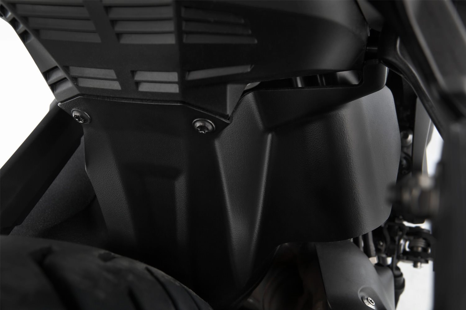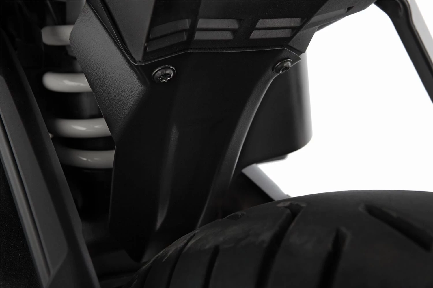 Dieser Innenkotflügel schützt das Federbein, die Federbeinaufnahme, die Schwinge sowie den Sammler. Er fängt die Wasseraufwirbelung auf und leitet sie zuverlässig ab. Dieses sinnvolle Bauteil reduziert und schützt gleichzeitig Fahrer und Beifahrer nachhaltig vor Gischt und Straßenschmutz im Bereich der Füße und Unterschenkel.