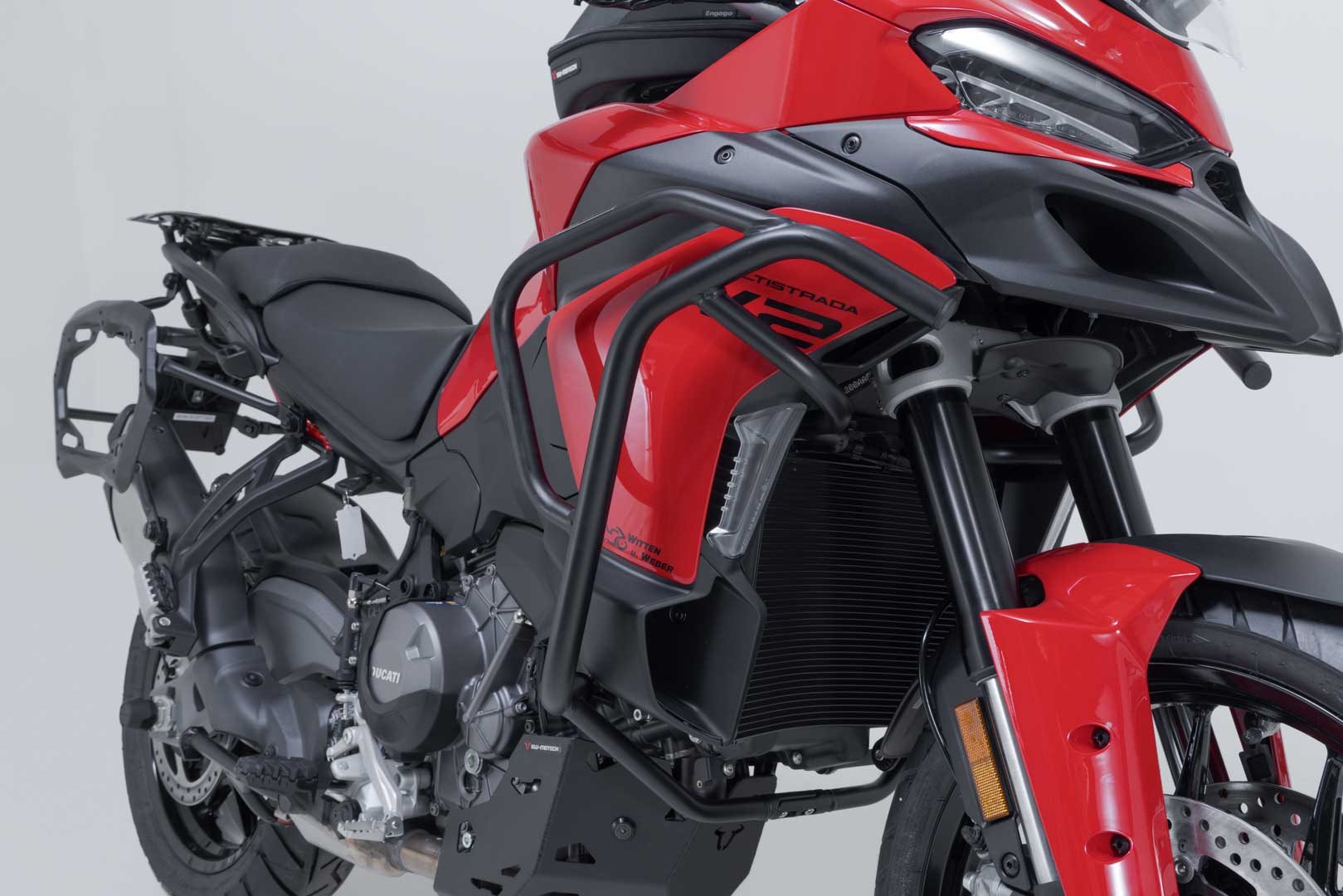 Passend zur Ducati Multistrada V2 / V2 S werden die Sturzbügel aus robustem Stahlrohr mit witterungs- und korrosionsbeständiger Pulverbeschichtung in Schwarz angeboten. Die Oberflächenveredelung erfolgt in einer hochmodernen Anlage im SW-MOTECH Werk im tschechischen Brünn.
