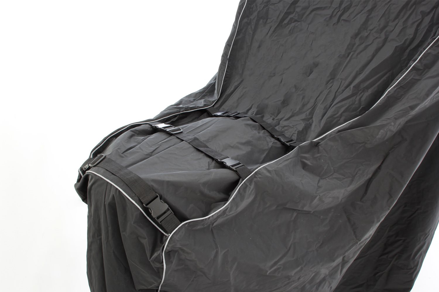 - Unterseitig ist ein Gurt zur sturmsicheren Fixierung des Outdoor-Covers zwischen den Rädern des Motorrad angebracht
