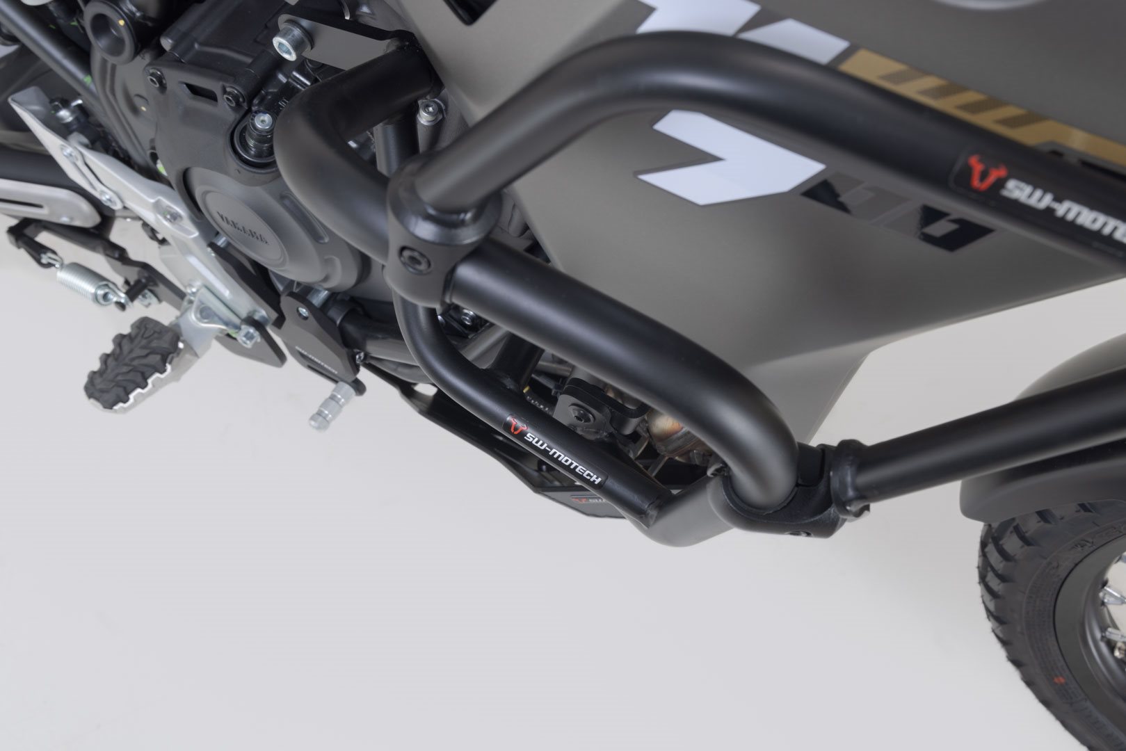 Passend zur Yamaha Ténéré 700 werden die Sturzbügel aus Stahlrohr mit 22 mm / 27 mm Durchmesser mit witterungs- und korrosionsbeständiger Pulverbeschichtung in Schwarz angeboten. Die Oberflächenveredelung erfolgt in einer hochmodernen Anlage im SW-MOTECH Werk im tschechischen Brünn.
