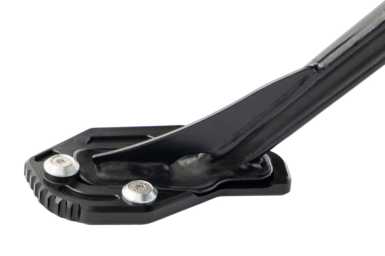 Die Lebensversicherung für Ihre Pan Am: Durch die kleine Aufstandsfläche des Original-Seitenständers besteht die Gefahr des langsamen, häufig unbemerkten Einsinkens sowohl auf heißen Teerflächen als auch bei nur leicht aufgeweichtem Untergrund. Eine präzise formgefräste Auflagenvergrößerung, die einfach an den Seitenständer geschraubt wird, beseitigt wirkungsvoll diesen konstruktiven Mangel. Und damit der Seitenständer locker mit der Stiefelferse ausgeklappt werden kann, haben wir eine Außenverzahnung eingearbeitet.