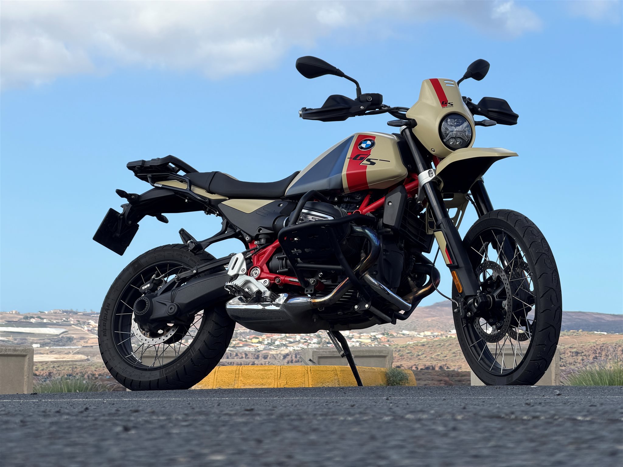 Als Zubehör waren Sturzbügel montiert, praktisch und ehrlich. Für den Verleiher Canary Ride ein Segen, für uns ideal, um Kameras zu montieren. Im Vergleich zur R 1300 GS und zur GS Adventure ist die R 12 G/S klar unpraktischer, unruhiger, anstrengender. Bei den schnellen Überholmanövern auf der Autobahn wirkte sie auch wirklich etwas schwächer. Am Kurvenausgang wirkt sie weniger brutal, aber keinesfalls langweilig. Der Motor fühlt sich irgendwie besser dimensioniert an. Bei den 1300er Modellen wirkt der Motor eigentlich immer wieder mal zu brutal für eine Enduro - der hier ist goldrichtig!