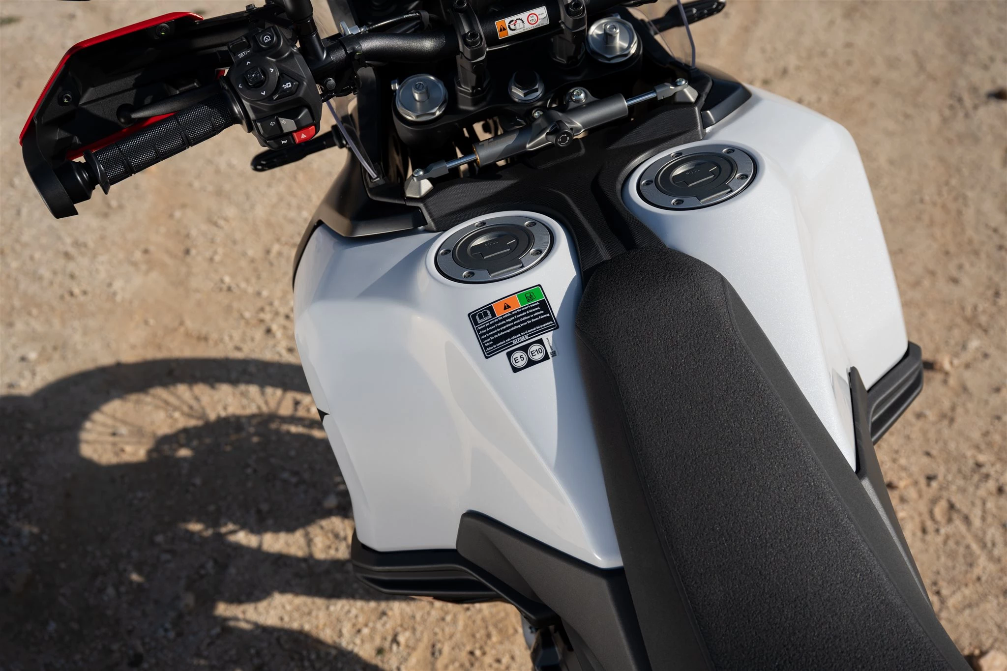 Mit dem Modelljahr 2026 hält erstmals eine umfangreichere Elektronikplattform Einzug in die World Raid. Grundlage dafür ist eine neue 6-Achsen-IMU - bisher die einzige der ganzen T7-Palette. Sie liefert Daten für die schräglagenabhängige Traktionskontrolle, die sich in den Stufen ”Offroad” und ”Street” einstellen oder komplett ausschalten lässt. Zusätzlich gibt es eine Slide Control (nur aktiv bei eingeschalteter Traktionskontrolle), die über den Driftwinkel des Hinterrades wacht, sowie eine abschaltbare ”Brake Control”, die die Kurvenfunktion des ABS regelt. Jenes kann fürs Offroaden wahlweise nur am Hinterrad oder auch komplett deaktiviert werden, ein separater ABS-Knopf links neben dem Instrument ermöglich außerdem einen unkomplizierten Schnellzugriff, wenn man von der Straße ins Gelände (oder umgekehrt) abbiegt.