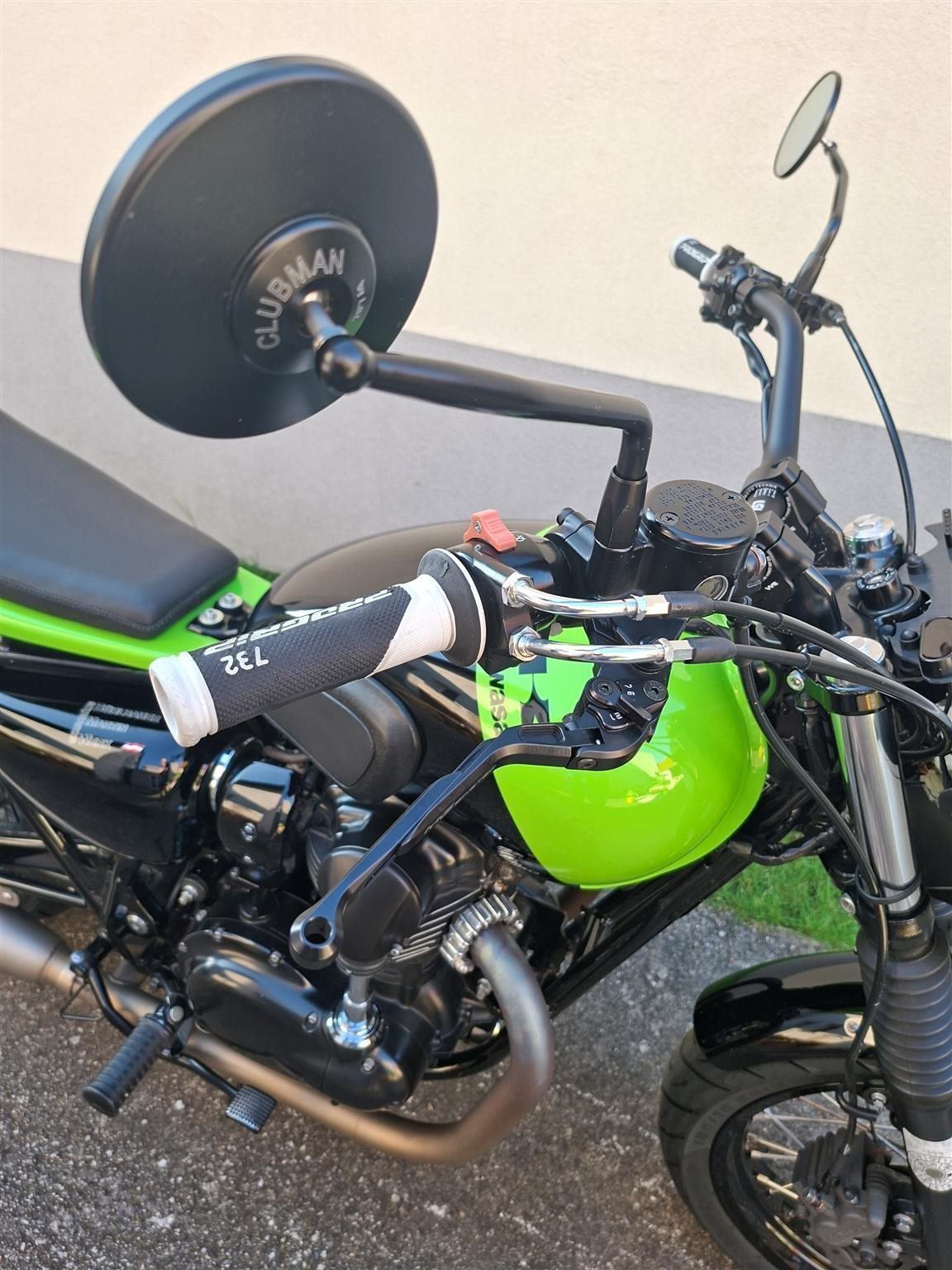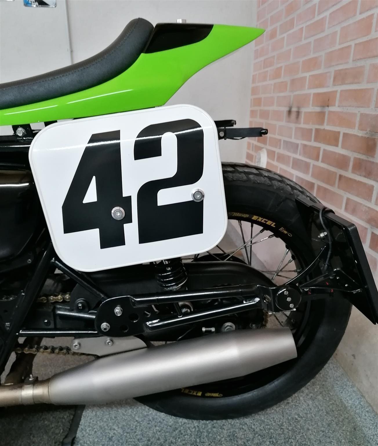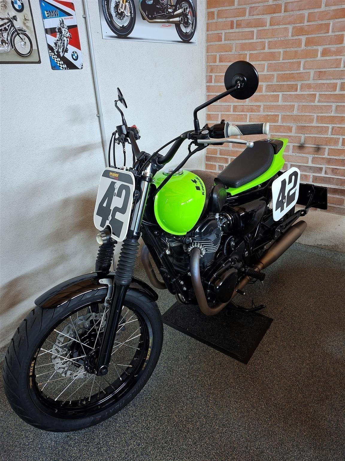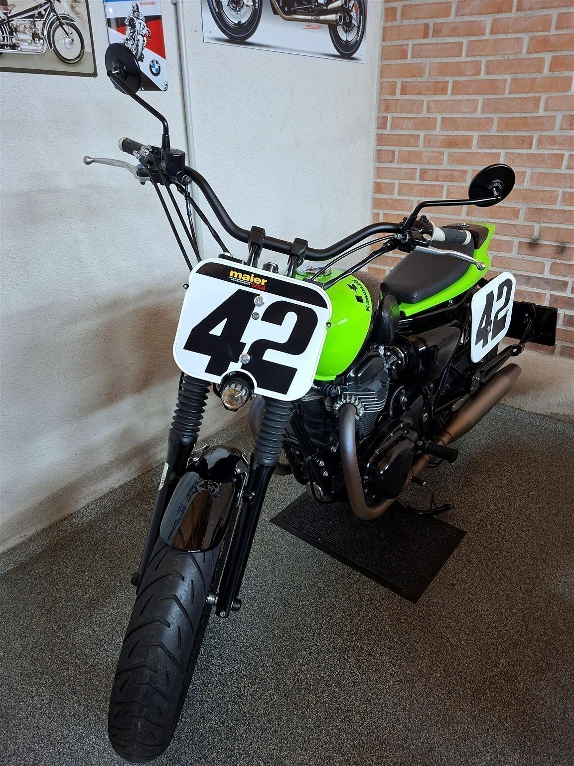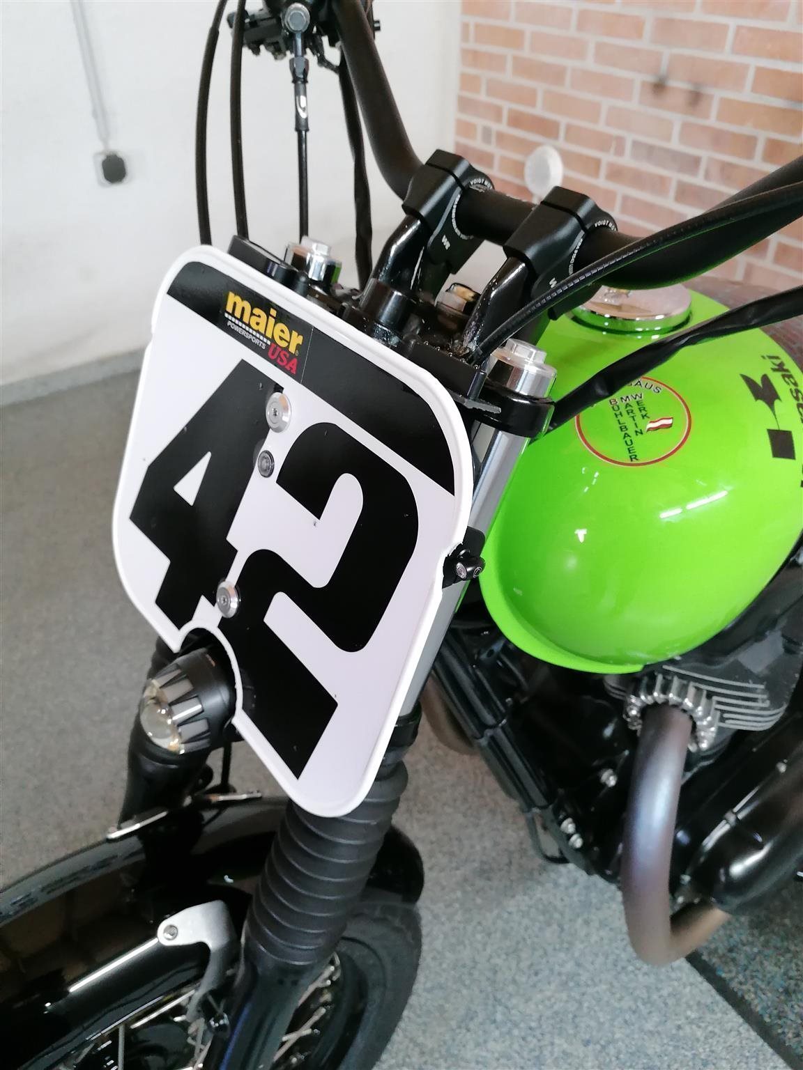 Umbau zum Flat Tracker nach Amerikanischen Style mit Königswellenmotor 48 PS und 60 Nm . Wurde einem Motorrad nachempfunden das bryan smith 2015 in der Amerikanischen Flat Track Meisterschaft gefahren hat . Allerdings wurde da ein anderes Modell von Kawasaki verwendet nähmlich eine Ninja 650 umgebaut zum Flat Tracker . Seinem Motorrad von damals ist meine von Style her nachgebaut . Alle Teile sind vom TÜV abgenommen und eingetragen . Ich wollte ein Motorrad so aufbauen das vom Aussehen nach es einem Race Bike sehr ähnlich ist aber die Anbauteile die im Straßenverkehr notwendig sind nicht sofort ins Auge fallen . Blinker , Licht und Tachoeinheit sind minimalistisch ausgeführt aber zugelassen . Teile von Remus , Wilbers , Kellerman , LSL , Voigt , Motogadget , Bremsscheibe Braking ( Wave ) , Reifen Dunlop DT 3 R mit Straßenzulassung und Felgenringe von Excel und noch viele andere wurden verwendet . Es sind jetzt breitere Reifen in den Dimensionen vorne 120 / 70 / 19 " und hinten 150 / 70 / 18 " montiert ( Original sind vorne 100 / 90 / 19 " und hinten 130 / 80 / 18 " ) . Die Teile und Modifikationen hier alle aufzulisten würde zu lange dauern und wahrscheindlich nicht alle Interessieren . Eure Meinung zum Umbau würde mich Interessieren . Was hättet ihr anders gemacht und was gefällt ? Danke und Allzeit gute Fahrt . Zwei Bilder zeigen das Motorrad mit Metzeler Tourance next 2 Bereifung und Carbon Heck das wahlweise verwendet werden kann . " Motorrad ist unter Umständen auch zu verkaufen " . ( Ist ein Einsitzer und auch keine Reisemaschine ) ! Für Sammler und Eisdielen bzw. Promenaden " Heizer " . Winterpreis vorbei .