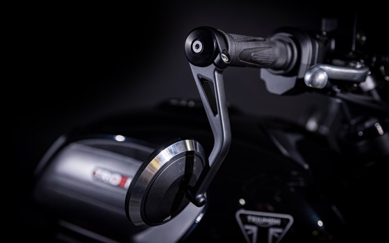 Bei dieser Trident 660 wurden neben den Lenkerenden Spiegel noch verschiedene andere Umbaumaßnahmen ausgeführt. Der Radsatz wurde komplett lackiert und mit roter Speiche versehen ! lackiert. Außerdem wurden die Hitzeschutzbleche am Abgassystem in schwarz mattiert. Die Cockpitverkleidung in Fahrzeugfarbe sieht schick aus und hält zusätzlich noch einen teil des Fahrtwind ab.